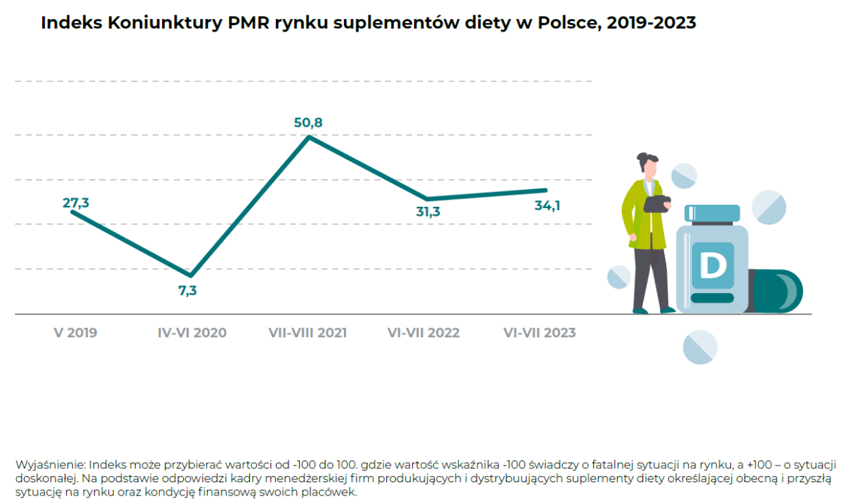 Według badań przeprowadzanych przez PMR, na rynku suplementów diety na przestrzeni ostatnich 17 lat, sytuacja w sektorze jest obecnie oceniana bardzo dobrze w porównaniu do poprzednich lat. Dwie trzecie respondentów – menedżerów firm obecnych na rynku (producentów i dystrybutorów) – ocenia ją pozytywnie (jako dobrą lub bardzo dobrą).