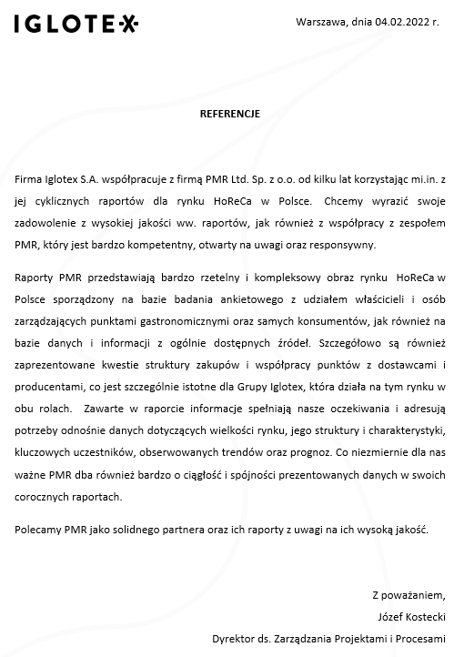 Firma Iglotex S.A. współpracuje z firmą PMR Ltd. Sp. z o.o. od kilku lat, korzystając m.in. z jej cyklicznych raportów dla rynku HoReCa w Polsce. Chcemy wyrazić swoje zadowolenie z wysokiej jakości tych raportów, jak również we współpracy z zespołem PMR, który jest bardzo kompetentny, otwarty na uwagi oraz responsywny. Co niezmiernie dla nas ważne, PMR bardzo dba również o ciągłość i spójność danych prezentowanych w swoich corocznych raportach. Polecamy PMR jako solidnego partnera oraz ich raporty z uwagi na ich wysoką jakość.